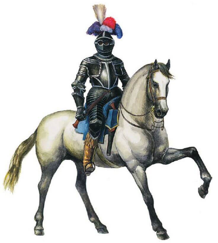 Таким образом противник попадал под непрекращающийся огонь, который не давал ему собраться. Топот тяжелых коней, треск выстрелов и вид закованных в доспехи всадников оказывали дополнительный деморализующий эффект.